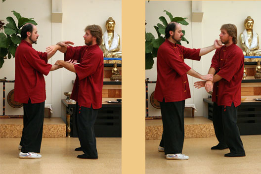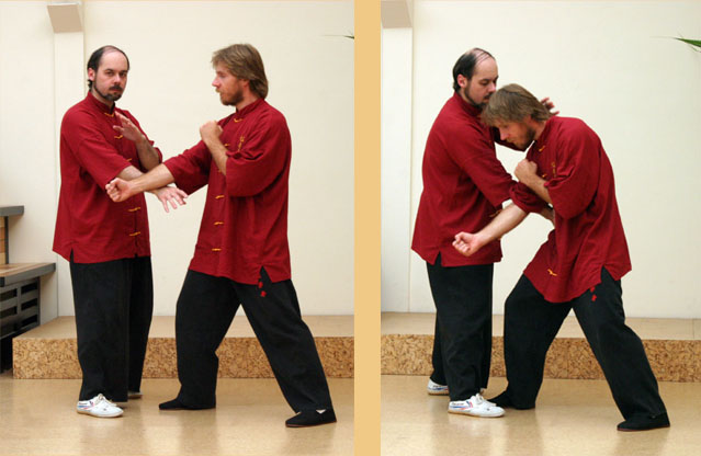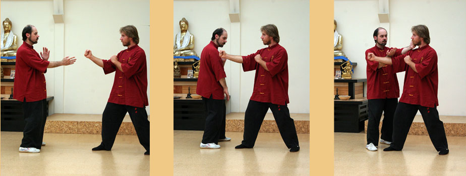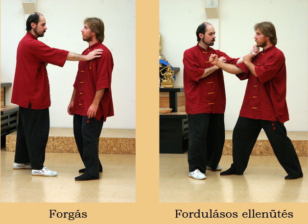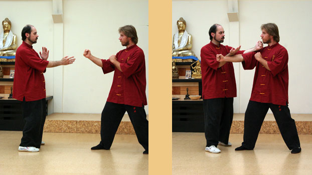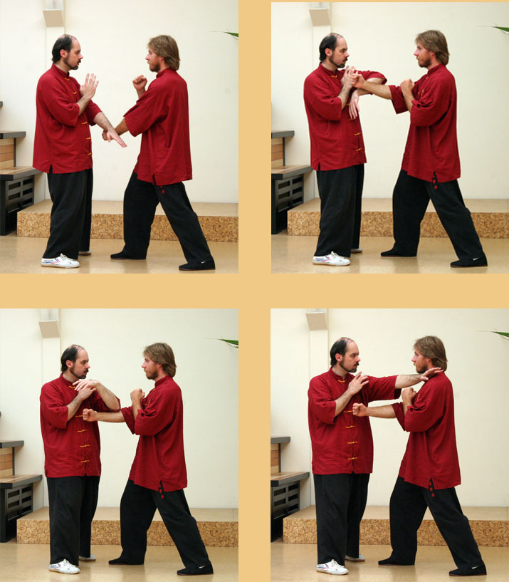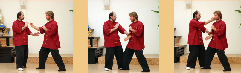 A hatásosság növeléseként a Wing Chun mesterei elvetették az "adok-kapok" jellegű küzdelmet. Az ellentámadás vagy egyidőben történik a védéssel (egyik kézzel háritunk, a másikkal ugyanakkor ütünk), vagy a védést követően azonnal támadunk, vagy pedig a hárító kéz mozgása alakul át támadássá - következő képsorozatok.