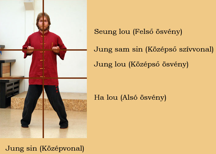 A mozgásokat, forgásokat e körül végezzük, s a gyakorlás során kiemelkedő fontosságú, hogy a középvonalunk megfelelő helyzetben legyen. Ugyanakkor a vonal mentén találhatóak a test sérülékeny belső szervei, így a támadások során ezt a területet támadjuk, s ezek a leginkább védendő területek. Ez a test legtehetetlenebb része is, így támadás esetén, ha az oldalunkat támadják, egy fordulással semlegesíthetjük azt, míg a középvonalra vezetett támadásokat elsősorban kézzel hárítjuk. Az ellenfél középvonala változhat attól függően, hogy milyen irányból támadunk, illetve, hogy milyen szögben áll hozzánk képest. Fontos az is, hogy a test és a hát egyenes legyen. A Wing Chun-ra nem jellemzőek az olyan mozdulatok, amely során előre, vagy hátra kellene hajolni A támadás elől nem elhajol, hanem elmozog a stílus képviselője.