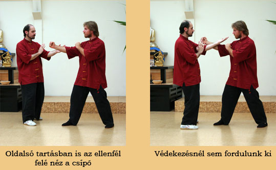 A Wing Chun-ban az állásokat úgy alakították ki, hogy a csípő mindig előre néz, az ellenfél felé. ("A Dan dian az ellenfél középvonalára néz.") - Ehhez a két kéz egyforma (és egyenlő szintű) használatára van szükség. Ugyanakkor ezek a tartások soha nem merevek. Támadásnál mindig az ellenfél védtelenebb, gyengébb oldala felé igyekszünk támadni, védekezésnél pedig az ellenfél erejét megkerülve semlegesítjük azt (forgások, fordulásos védések, kis lépések).
